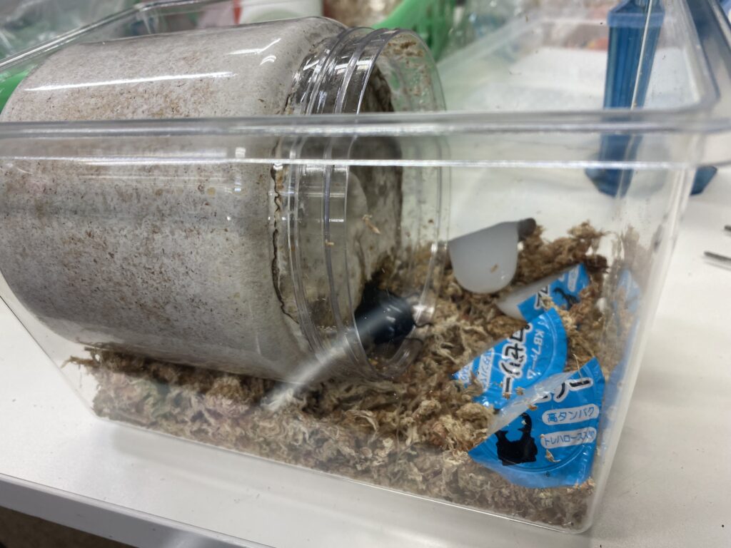 ゼリー2個を半分にカットし、完食もしくはゼリーが乾いてきたら交換、床材は水で湿らせた水苔を敷き詰める。
