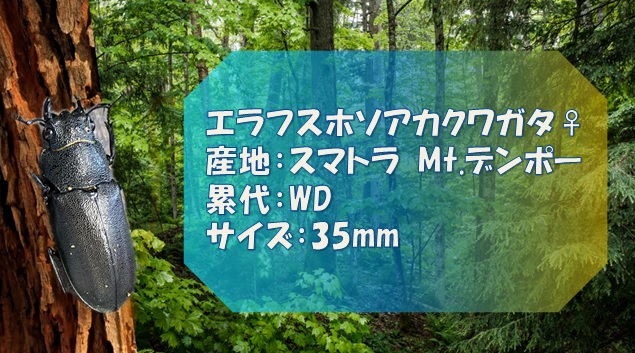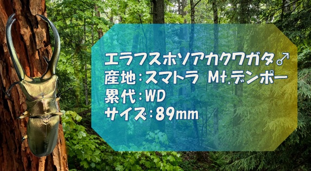 インドネシアのスマトラMt.デンポ採取のエラフスホソアカクワガタのペアを購入。オスは色、形どれをとってもパーフェクトにかっこいいクワガタだ。
