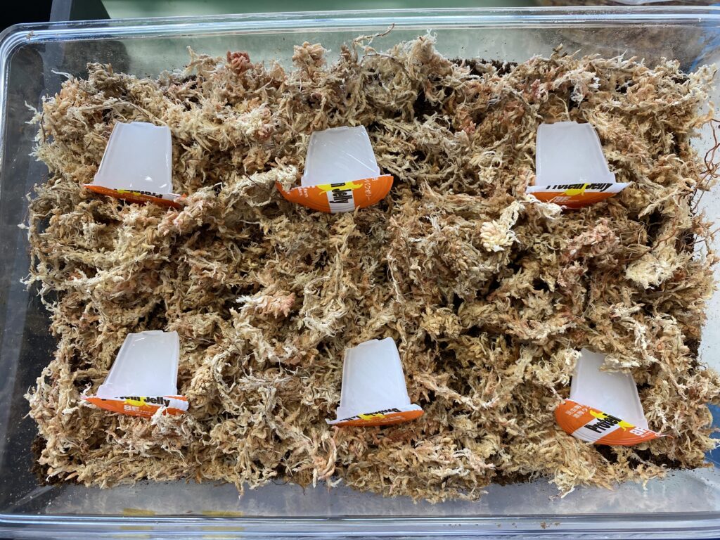 ゼリーは1匹につき1個を半分カット、完食もしくは3,4日で交換、床材は3〜5センチほどひき、水苔が水分をこれ以上吸えない感じがしてきたらケースを洗浄し新しい物に取り替える。