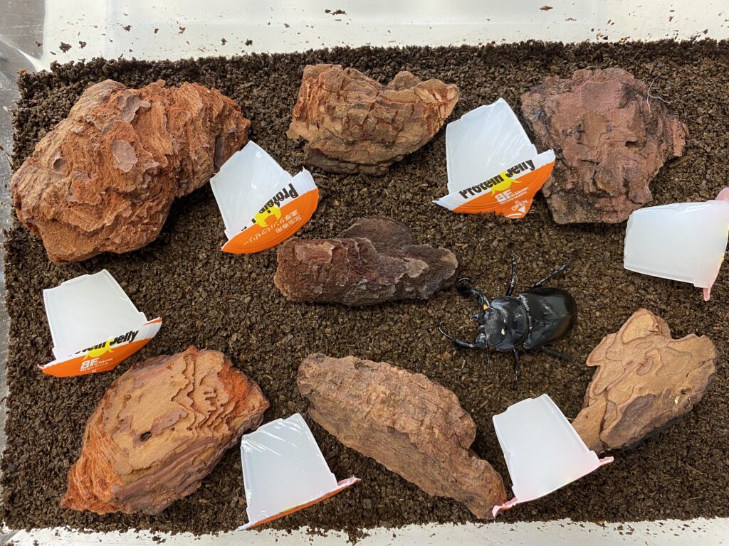 ゼリーを半分にカットし、完食もしくは1週間に1度交換、水苔は汚れたら交換する。