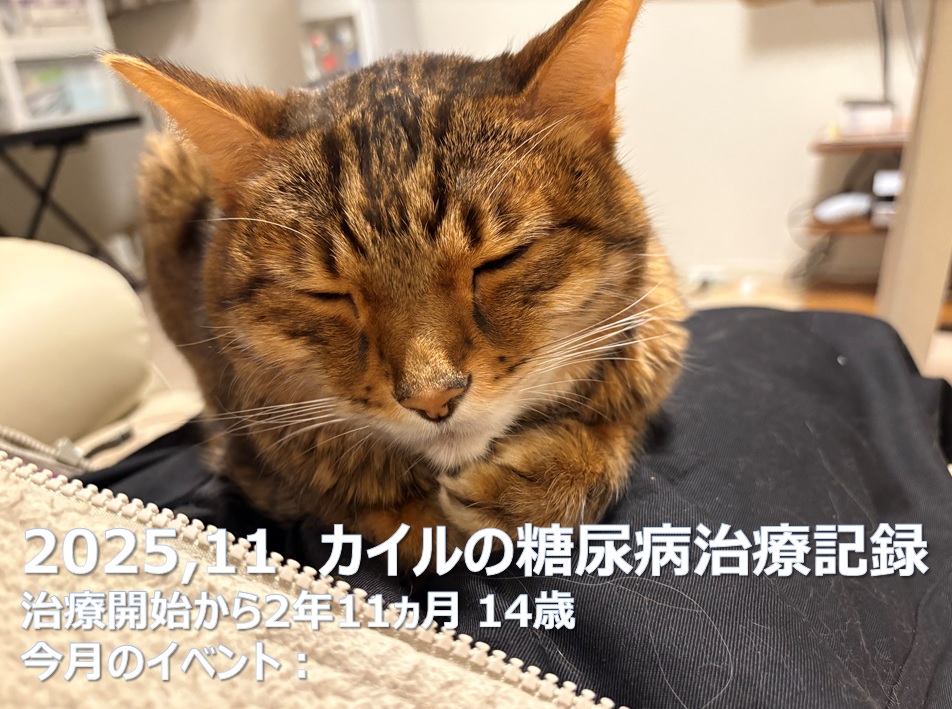 猫の糖尿病経過観察記録カイルが糖尿病になり2年11ヵ月が経過しました。今月も先月から引き続き特に記載することがない程元気です。